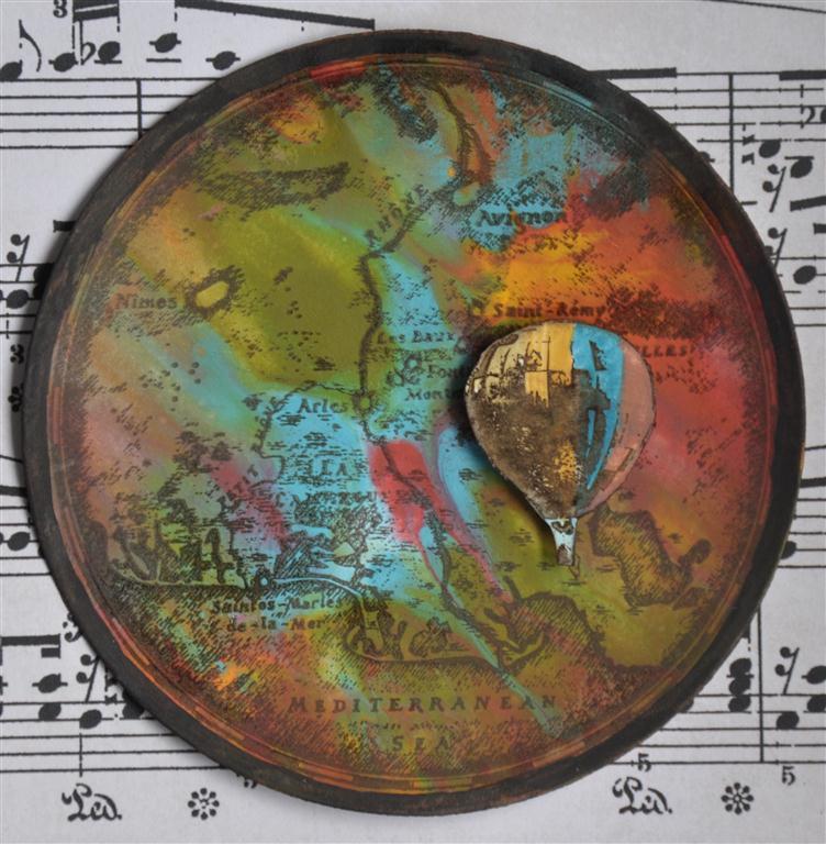 De 2e cirkel heb ik de achtergrond gekleurd met de nieuwe distress paint, deze reageert op water en loopt dan heel mooi in elkaar over. De wereld gestempeld met zwarte stazon en de rand met een zwarte distress marker dik aangezet. De ballon heb ik gekleurd met de distress markers en met 3D tape opgeplakt.